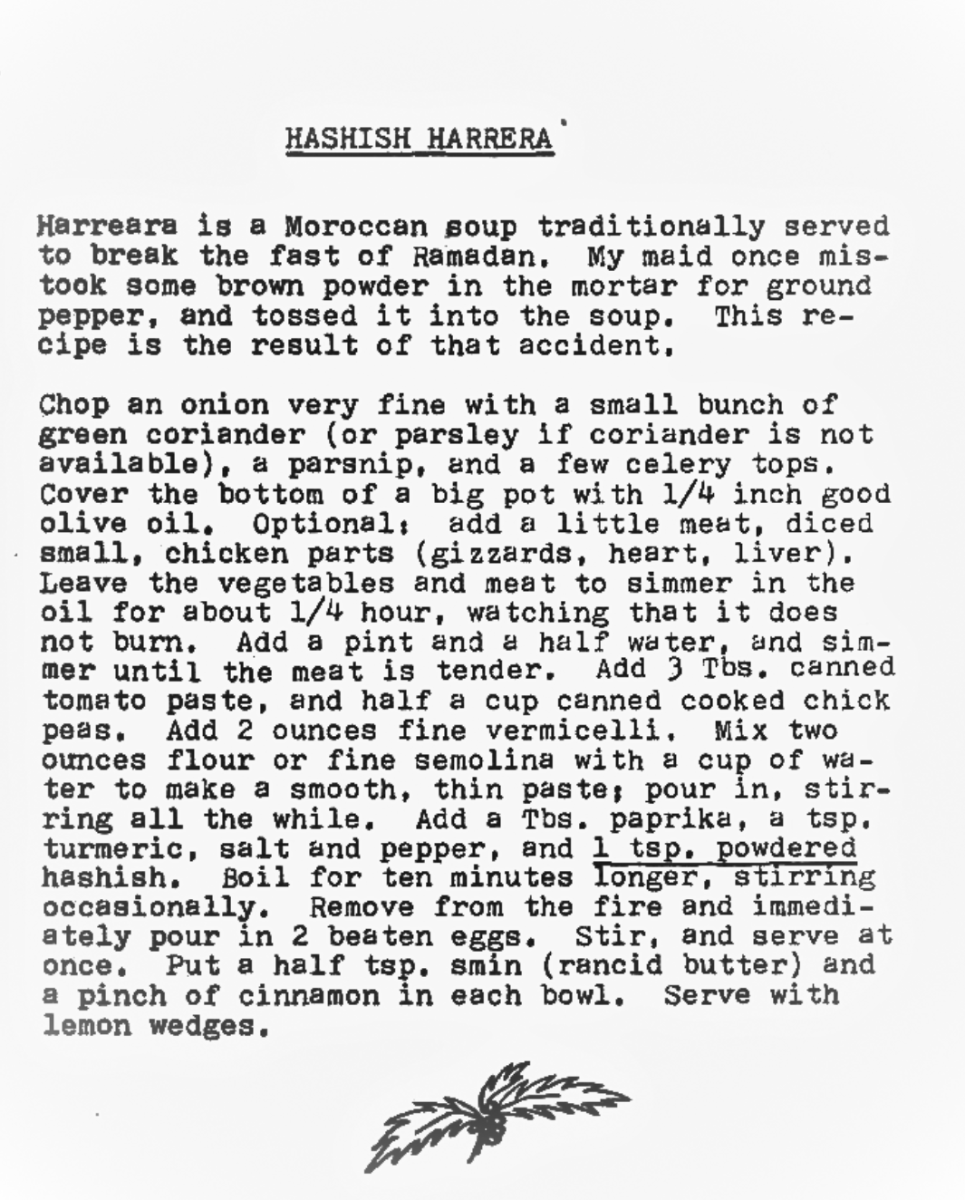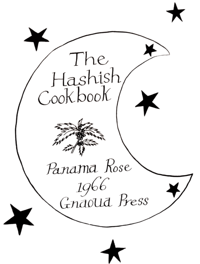 The Hashish Cookbook by Panama Rose was first published in 1966 by Ira Cohen. The Cookbook contains international recipes and illustrations throughout—offering chefs & readers a taste of “the sixties.” Panama Rose, also known as Rosalind Schwartz, arranged and designed the entirety of the cookbook. The American artist and filmmaker,Ira Cohen, whom at the time was in a relationship with Panama Rose, published the first edition of the Cookbook in Morocco. A year later, it was published by Gnaoua Press (USA), making it a sensational underground bestseller.